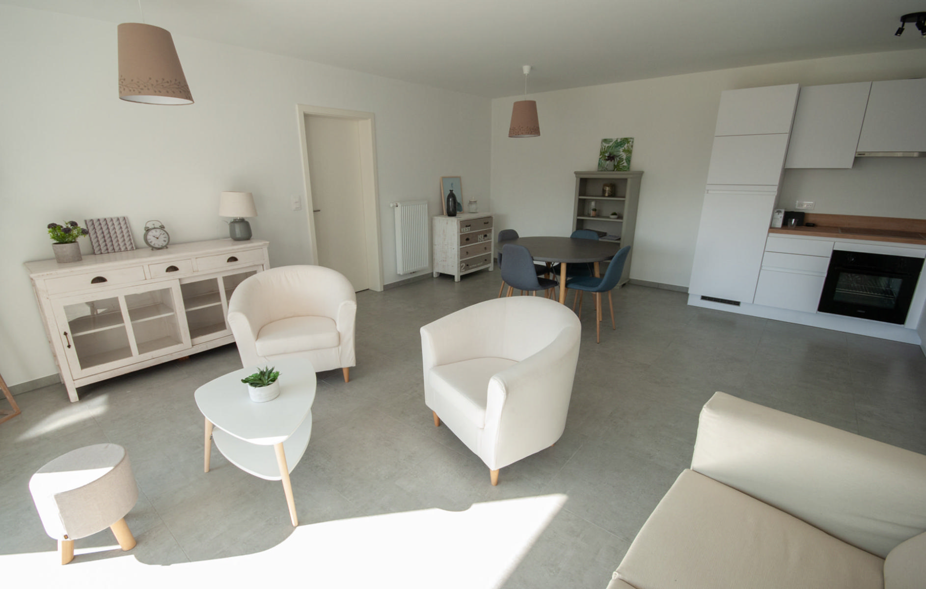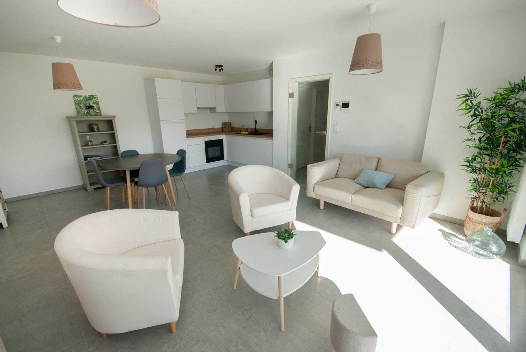 Situé au rez-de-chaussée, cet appartement de 2 chambres (86 m²) est composé d’un hall d’entrée, d’un lumineux séjour ouvert sur une cuisine équipée (taque de cuisson vitrocéramique, four, hotte, frigo encastré, congélateur, lave-vaisselle), d’une salle de bain avec douche, de deux chambres à coucher confortables, d’une buanderie pratique et d’un WC indépendant.