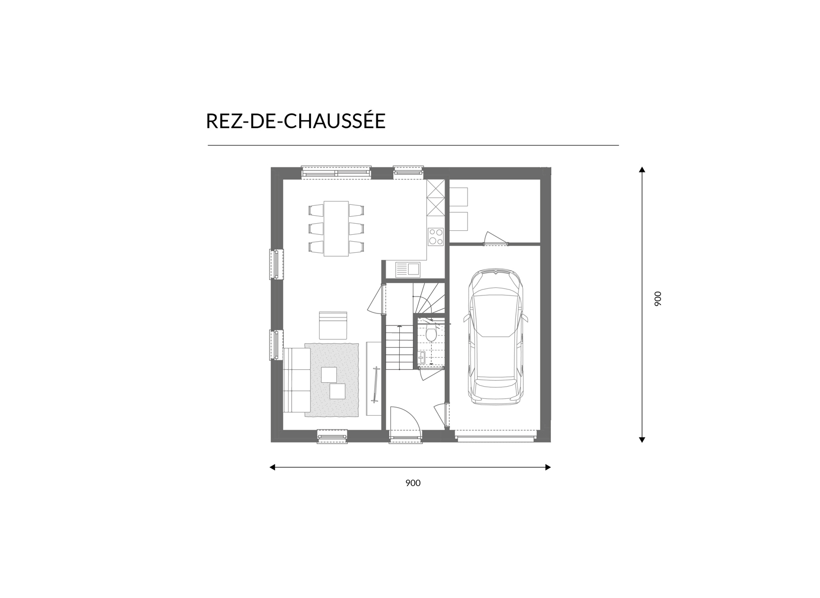 Rez-de-chaussée : Hall d’entrée accueillant, Séjour lumineux avec cuisine ouverte entièrement équipée, Buanderie pratique, WC séparé, Garage intégré.