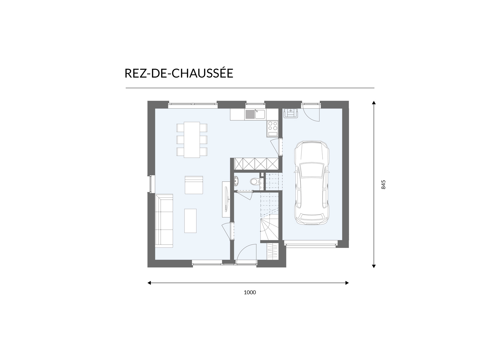 Rez-de-chaussée : Hall d’entrée, lumineux séjour ouvert sur une cuisine entièrement équipée, WC séparé et garage intégré.